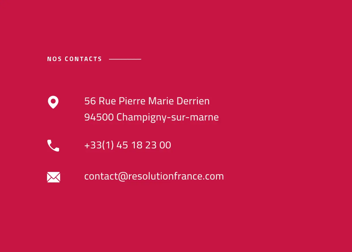 Bienvenue chez RESOLUTION ! Ecrivez-nous et nous nous ferons un plaisir de vous répondre dans les meilleurs délais.
